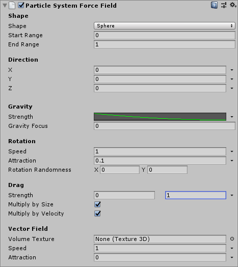Attraction | Set the strength at which Unity drags particles into the vector field motion. The higher the value, the greater the attraction. You can specify a constant attraction or vary the attraction over time. See Varying properties over time. |