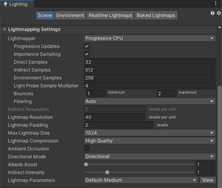Lightmapper | Use this to specify which internal lighting calculation software to use to calculate lightmaps in the Scene. The options are: Progressive CPU Progressive GPU Enlighten The default value is Progressive CPU. |