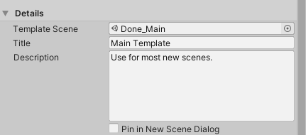 使用 Details 部分指定要用于模板的场景,并控制模板在 New Scene 对话框 中如何显示。