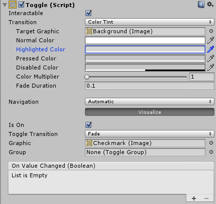 On Value Changed | 单击开关时调用的 UnityEvent。该事件可将当前状态作为 bool 类型动态参数发送。 |