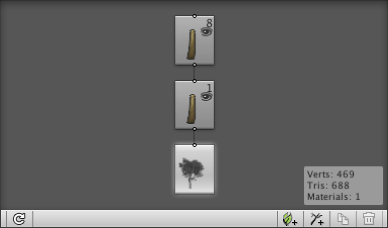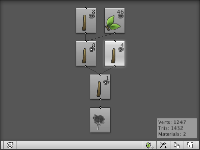 主图显示了这是哪种元素。右上角的数字表示树在该层级存在的树枝数,此数值由检视面板中的 Frequency 属性设置。选中给定图标后,更改 Frequency 值将更改该层级的树枝数。数字下方的眼睛图像表示 Scene 视图中的树枝可见性;单击眼睛可以打开或关闭可见性。