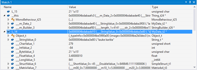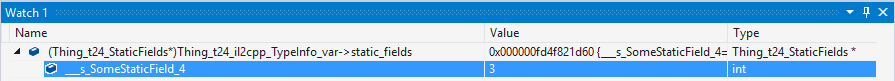 观察静态字段有点困难。在 IL2CPP 中,静态字段存储在 Il2CppClass 实例本身上。因此,为了观察静态字段,我们首先需要一个指向该类型 Il2CppClass 结构的指针。这些指针位于使用它们的方法的作用域内,但在观察一次之后,指针将在应用程序运行期间保持在相同的内存地址。Il2CppClass 结构具有“static_fields”字段,该字段便是一个指针,指向包含该特定类型的静态字段的内存块。要查看实际值,必须将此指针强制转换为适当的静态字段结构:每种类型都有自己的字段。例如,我们来观察 Thing_t24