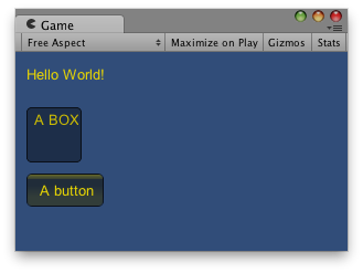 public class ExampleClass : MonoBehaviour { void OnGUI() { GUI.color = Color.yellow; GUI.Label(new Rect(10, 10, 100, 20), "Hello World!"); GUI.Box(new Rect(10, 50, 50, 50), "A BOX"); GUI.Button(new Rect(10, 110, 70, 30), "A button"); } }