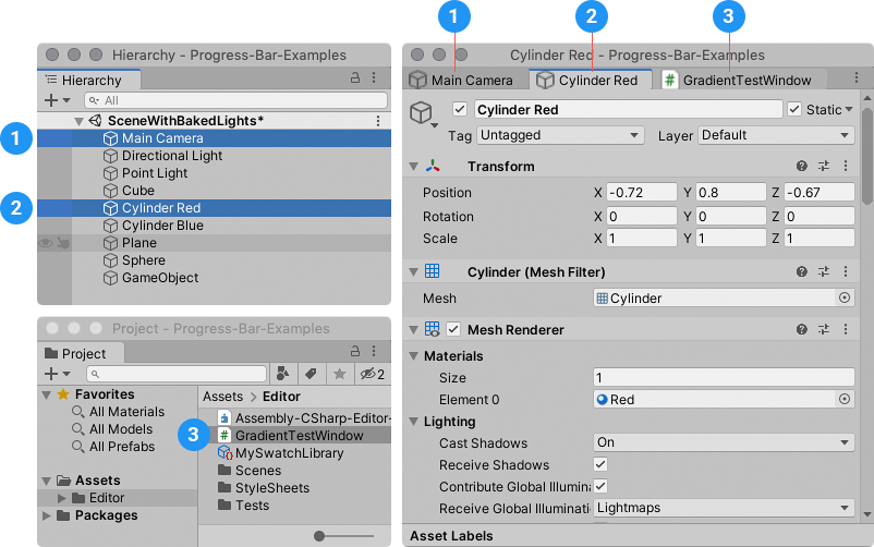下图显示了三个选定的项目(左):两个游戏对象和一个资源,以及为它们打开专属 Inspector 时的窗口(右)。