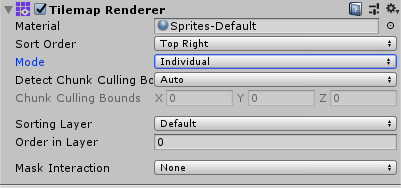 在 Individual Mode 模式下,Tilemap Renderer 会对瓦片地图上的精灵进行排序和渲染,同时考虑场景中的其他渲染器,例如 Sprite Renderer 和 Mesh Renderer。如果其他渲染器与瓦片地图上的精灵和对象进行交互,请使用此模式。