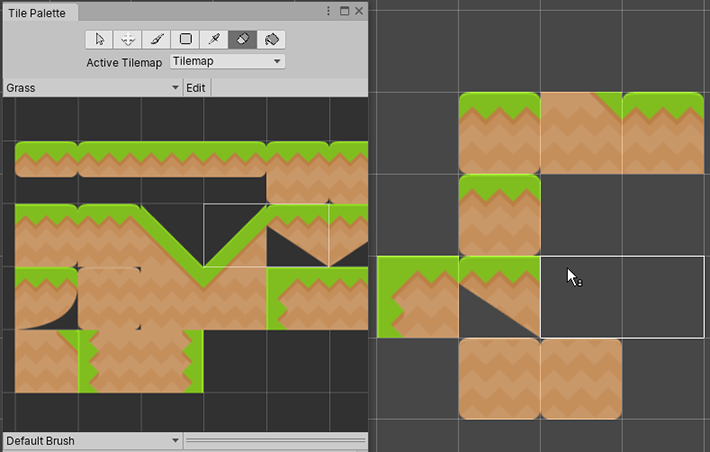 使用画笔工具选择瓦片地图面板 (Tilemap Palette) 中的瓦片,或按住并在多个瓦片上拖动来一次选择多个瓦片。然后单击场景中瓦片地图上的任何位置即可开始使用所选的瓦片进行绘制。使用画笔工具时按住 Shift 可切换到擦除工具