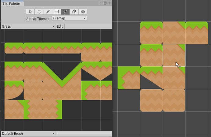 要使用瓦片地图上已有的瓦片而不是 Tilemap Palette 进行选择和绘制,请在使用画笔工具在瓦片地图上选择瓦片时按住 Ctrl。此时将快速切换到选取器工具以便选择用于绘制的瓦片。