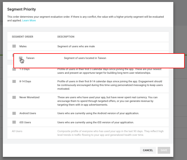 当一个玩家是多个细分段的成员时,Unity会将值发送给最高优先级的细分段。(如果一个设置没有任何细分值,或者玩家不是含有一个键对应多个值的细分段的成员,Unity会发送All Users值。)你可以设置细分段的顺序来指定当存在重叠时应该优先哪个细分值。