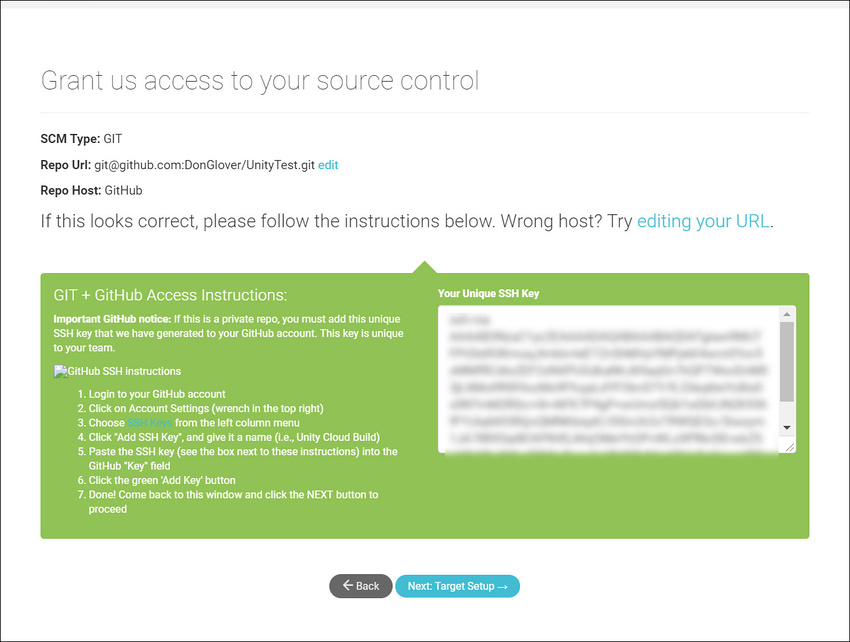 在 Grant us access to your source control 窗口上,单击 Next: Target Setup。