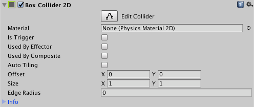 Edge Radius Controls a radius around edges, so that vertices are circular. This results in a larger Collider 2D with rounded convex corners. The default value for this setting is 0 (no radius).
