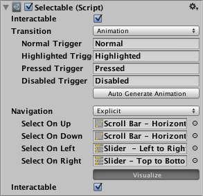 在以上可视化模式中,箭头指示如何为整个控件集合设置焦点变化。这意味着,对于每个单独的 UI 控件,如果用户在给定控件具有焦点时按下箭头键,您可以看到接下来将获得焦点的 UI 控件。因此,在上面显示的示例中,如果“Button”具有焦点并且用户按下向右箭头键,则第一个(左侧)垂直滑动条随后将获得焦点。请注意,无法使用向上或向下键将焦点从垂直滑动条上移开,因为这两个键用于控制滑动条的值。水平滑动条和左/右箭头键也是同样道理。