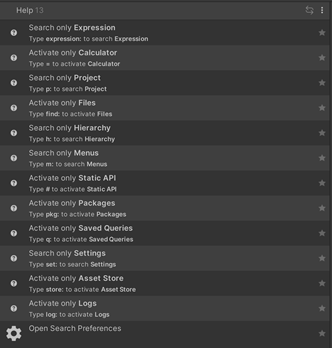 For example, from the Search window you can find Assets and open them, find Unity packages and install them, or find menu commands and run them.