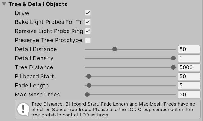 Preserve Tree Prototype Layers | 如果希望树实例采用其原型预制件的层值而非地形游戏对象的层值,请选中此复选框。 |