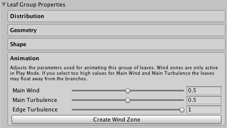 调整用于动画化此树叶组的参数。风区仅在播放模式下有效。如果为 Main Wind 和 Main Turbulence 选择的值太高,树叶可能会从树枝上浮起。