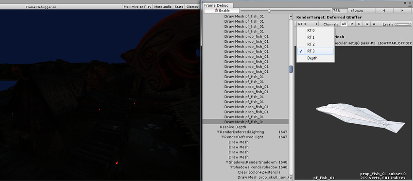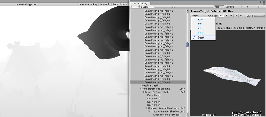 如果在选定的绘制调用中,RenderTexture 发生渲染,那么该 RenderTexture 的内容将显示在 Game 视图中。这可用于检查各种屏幕外渲染目标是如何构建的,例如延迟着色中的漫射 G 缓冲区: