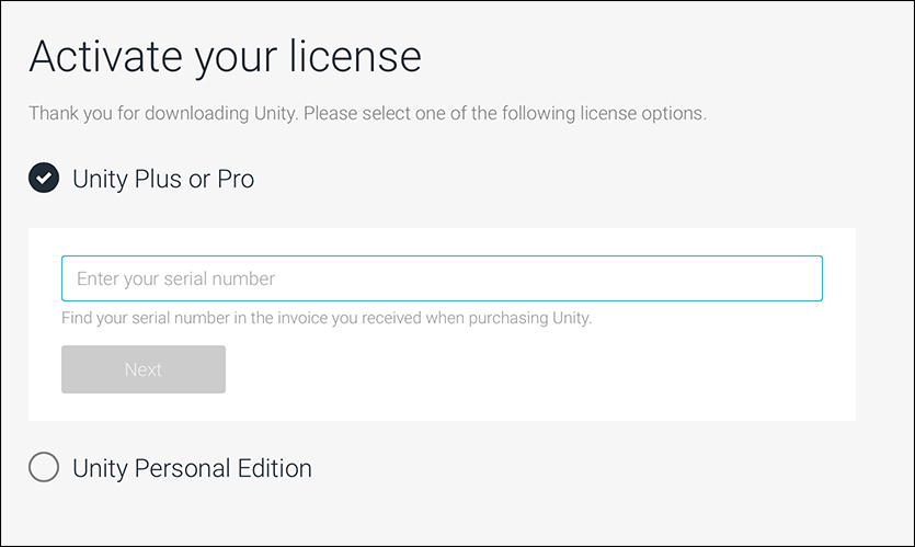 * 如果您选择 **Unity Plus or Pro** 选项,输入您在购买单个许可证时收到的电子邮件中的**序列号**。必须严格按照电子邮件中显示的格式输入密钥。例如,`PS/SC/E3-XXXX-XXXX-XXXX-XXXX`。