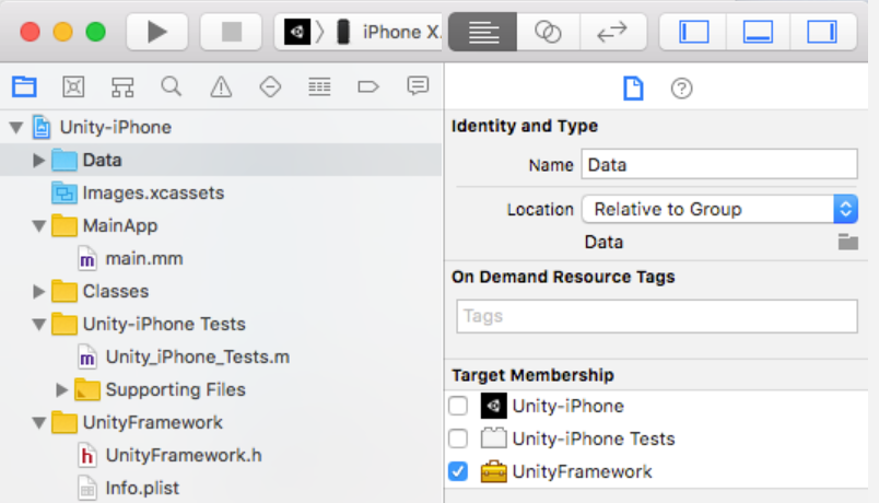 注意:仅当 Data 文件夹是应用程序目标的一部分而不是 UnityFramework 目标的一部分时,才支持按需加载资源 (On-Demand Resources)。