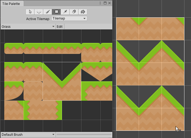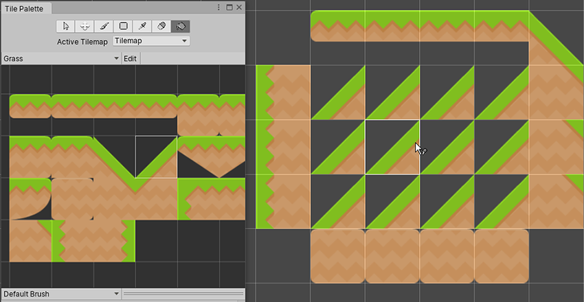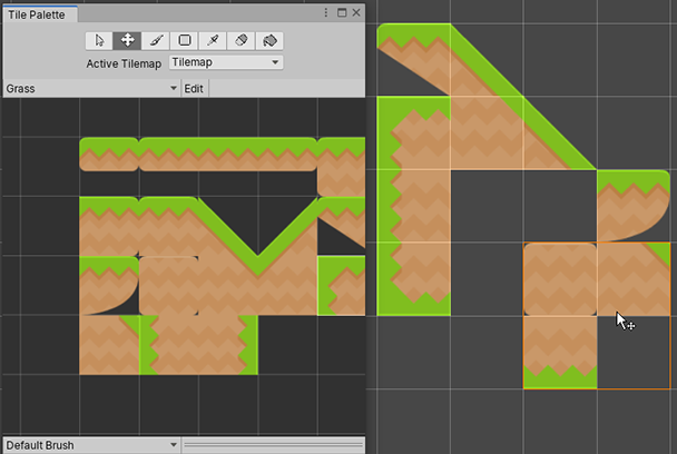 使用画笔工具选择瓦片地图面板 (Tilemap Palette) 中的瓦片,或按住并在多个瓦片上拖动来一次选择多个瓦片。然后单击场景中瓦片地图上的任何位置即可开始使用所选的瓦片进行绘制。使用画笔工具时按住 Shift 可切换到擦除工具。