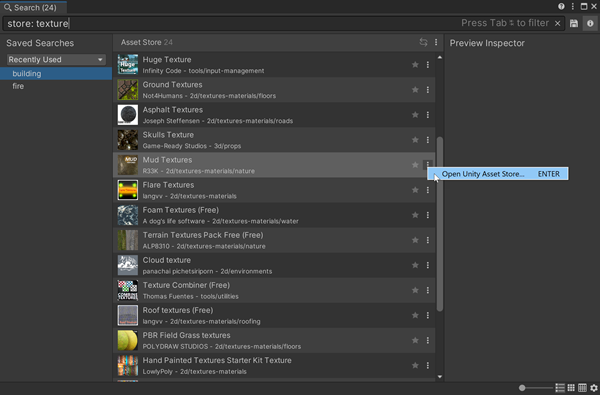 The Asset Store Search Provider searches the Unity Asset Store. The Preview Inspector displays a preview of each item. Open the Asset Store to see more information about an Asset, such as its name, price, publisher, and category.