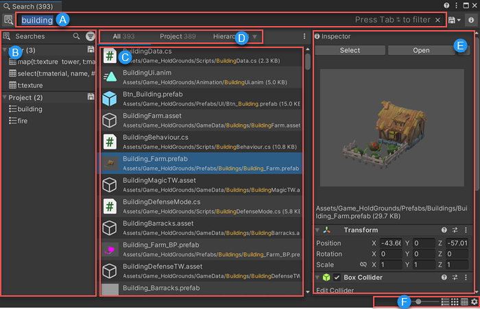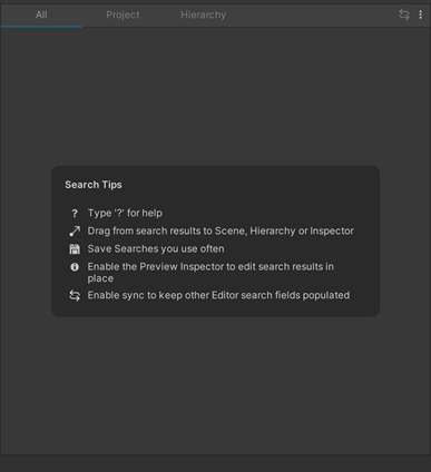For example, from the Search window you can find Assets and open them, find Unity packages and install them, or find menu commands and run them.