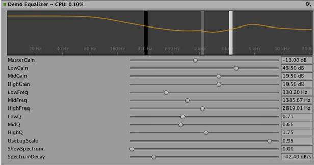 After Unity loads the native plug-in dlls and registers the contained audio plug-ins, it starts looking for corresponding GUIs that match the names of the registered plug-ins. This happens through the Name property of the EqualizerCustomGUI class which, like all custom plugin GUIs, must inherit from IAudioEffectPluginGUI