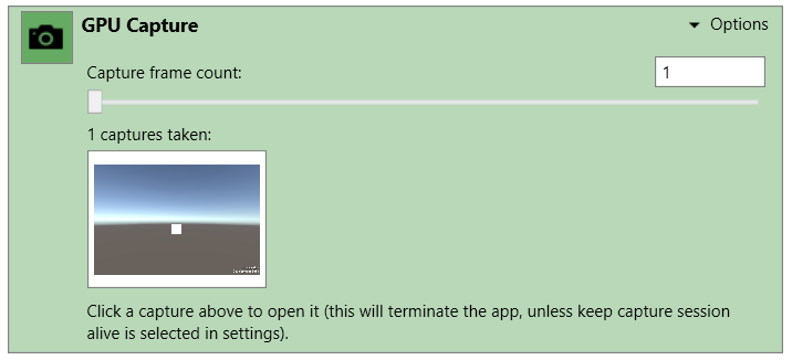 照常使用应用程序,直到准备好捕获帧。要捕获帧,请按键盘上的 Print Screen 键,或单击 GPU Capture 面板上的摄像机图标。在面板中将显示捕获的缩略图。要打开捕获结果,请单击缩略图。