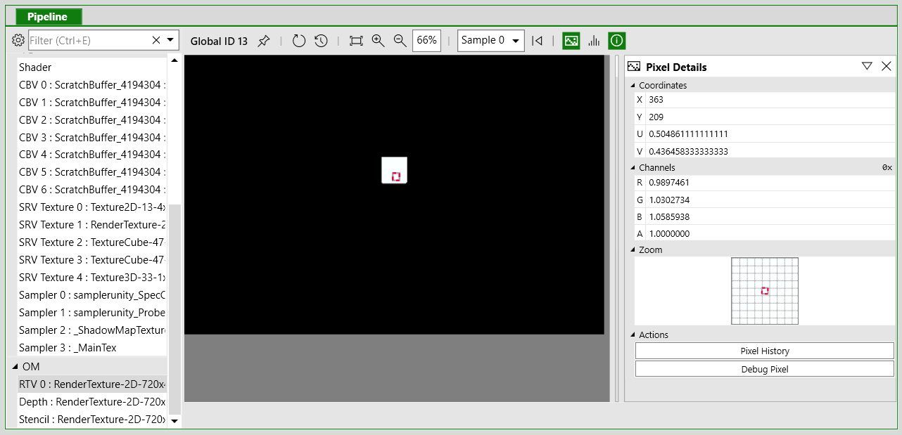 在 Pipeline 选项卡的下半部分,从 OM (Output Merger) 列表中选择一个渲染目标以查看绘制调用的输出。在要调试的对象上选择一个像素。请注意,为了查找感兴趣的绘制调用,一种方法是可以右键单击像素以查看绘制调用历史记录。
