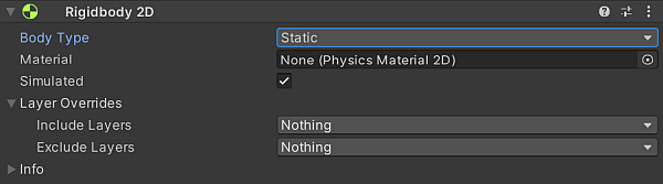 Aside from setting the Rigidbody 2D to the Static Body Type, there is another scenario where a Static Rigidbody 2D is created. This is when a GameObject with a Collider 2D component does not have a Rigidbody 2D component at all. All Collider 2Ds without a Rigidbody 2D component are internally considered to be attached to a single hidden Static Rigidbody 2D component.