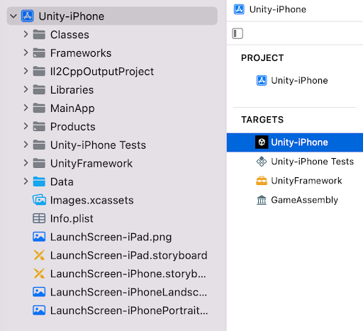 为 iOS 平台构建 Unity 项目时,Unity 将创建一个包含 Xcode 项目的文件夹。为了在将应用程序部署到设备上之前对此应用程序进行编译和签名,您需要该项目。此外,还需要使用该项目来准备和捆绑游戏,以便分发到 App Store 上。自 Unity 2019.3 起,Xcode 项目结构已更改,旨在支持通过 Unity 用作库将 Unity 集成到原生 iOS 应用程序中。