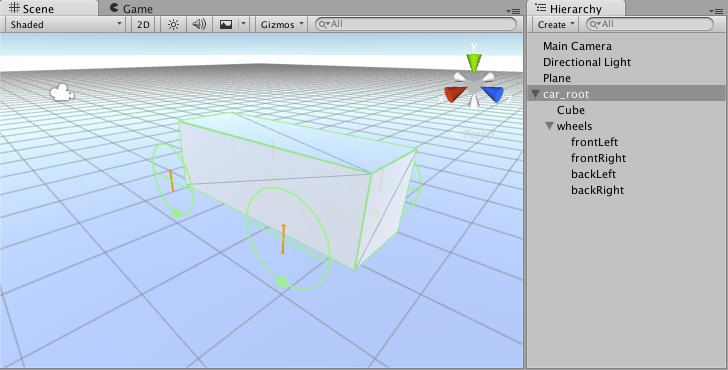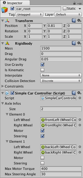 接下来看看可视车轮。如您所见,车轮碰撞体不会将模拟的车轮位置和旋转反向应用于车轮碰撞体的变换,因此添加可视车轮需要一些技巧。