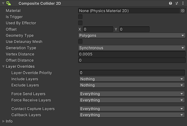 Synchronous | Select this to have Unity immediately generate new geometry when a change is made to the Composite Collider 2D or to any of the Colliders composing it. | |
