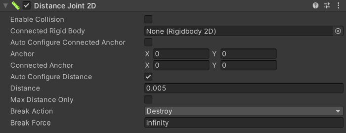 Auto Configure Distance | Enable this to automatically detect the current distance between the two GameObjects, and set it as the distance that the Distance Joint 2D keeps between the two GameObjects. When enabled, you do not need to specify the distance between the GameObjects at Distance. |
