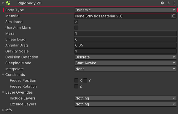 There are three options for Body Type which define the behavior of the Rigidbody 2D. Any Collider 2D attached to that Rigidbody 2D inherits the Rigidbody 2D’s Body Type as well. The three available options are: