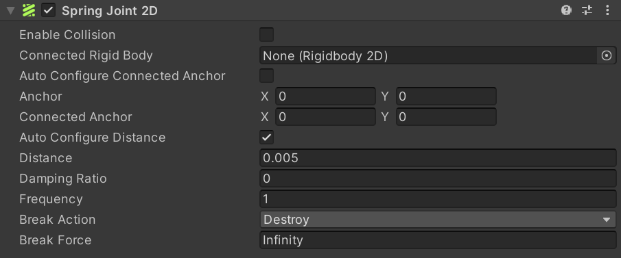 This joint behaves like a spring, while keeping a linear distance between two points. You set this via the Distance setting. Those two points can be two Rigidbody2D components or a Rigidbody2D component and a fixed position in the world. (Connect to a fixed position in the world by setting Connected Rigidbody to None). The joint applies a linear force to both rigid bodies. It doesn’t apply torque (an angle force).
