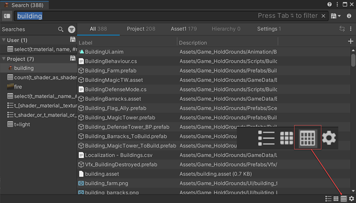 To view your search in table format, enter a search query and click the table icon in the bottom right of the Unity Search window.