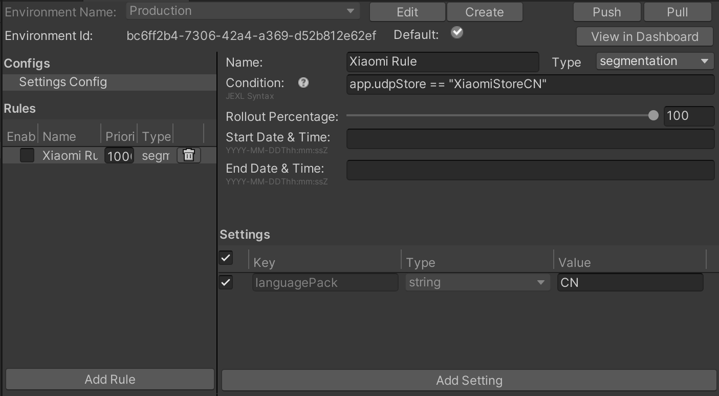 1.设置好参数并插入到游戏代码中后,请在 Remote Config 窗口中为每个商店创建一个规则。