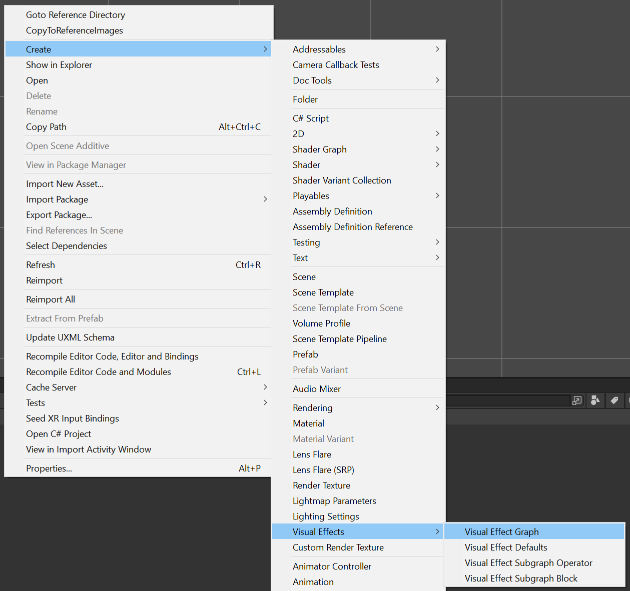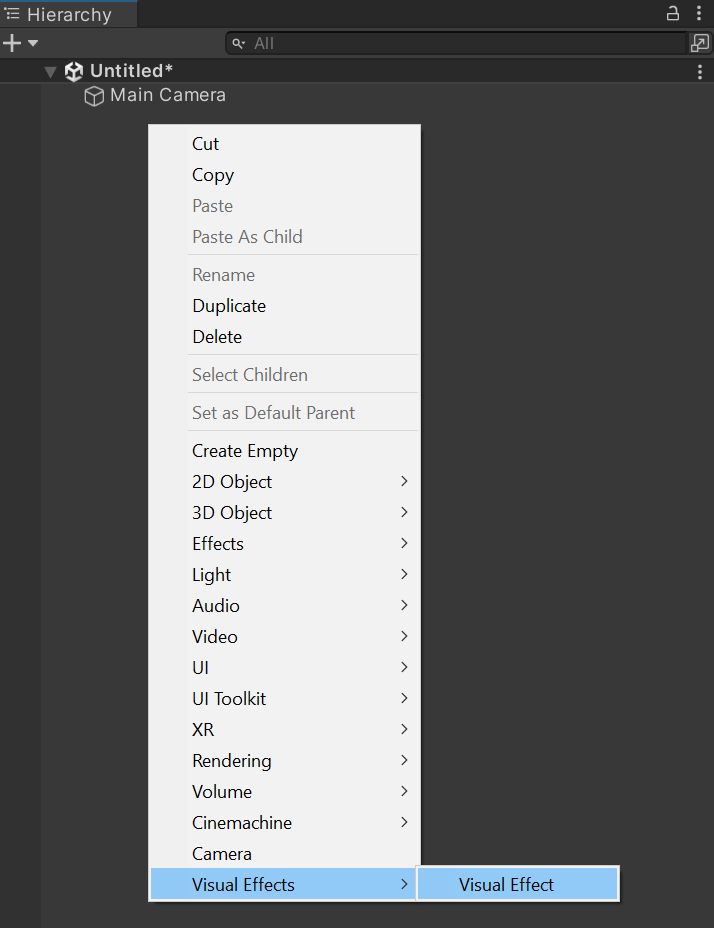 Create a new VFX asset by selecting Assets > Create > Visual Effects > Visual Effect Graph. The VFX asset is then created in the Asset