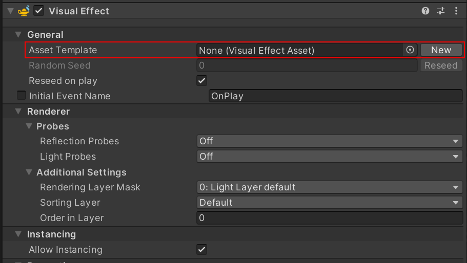In the Visual Effect properties, locate Asset Template and select the asset picker (circle). In the Select VisualEffectAsset window, select the VFX asset created earlier.