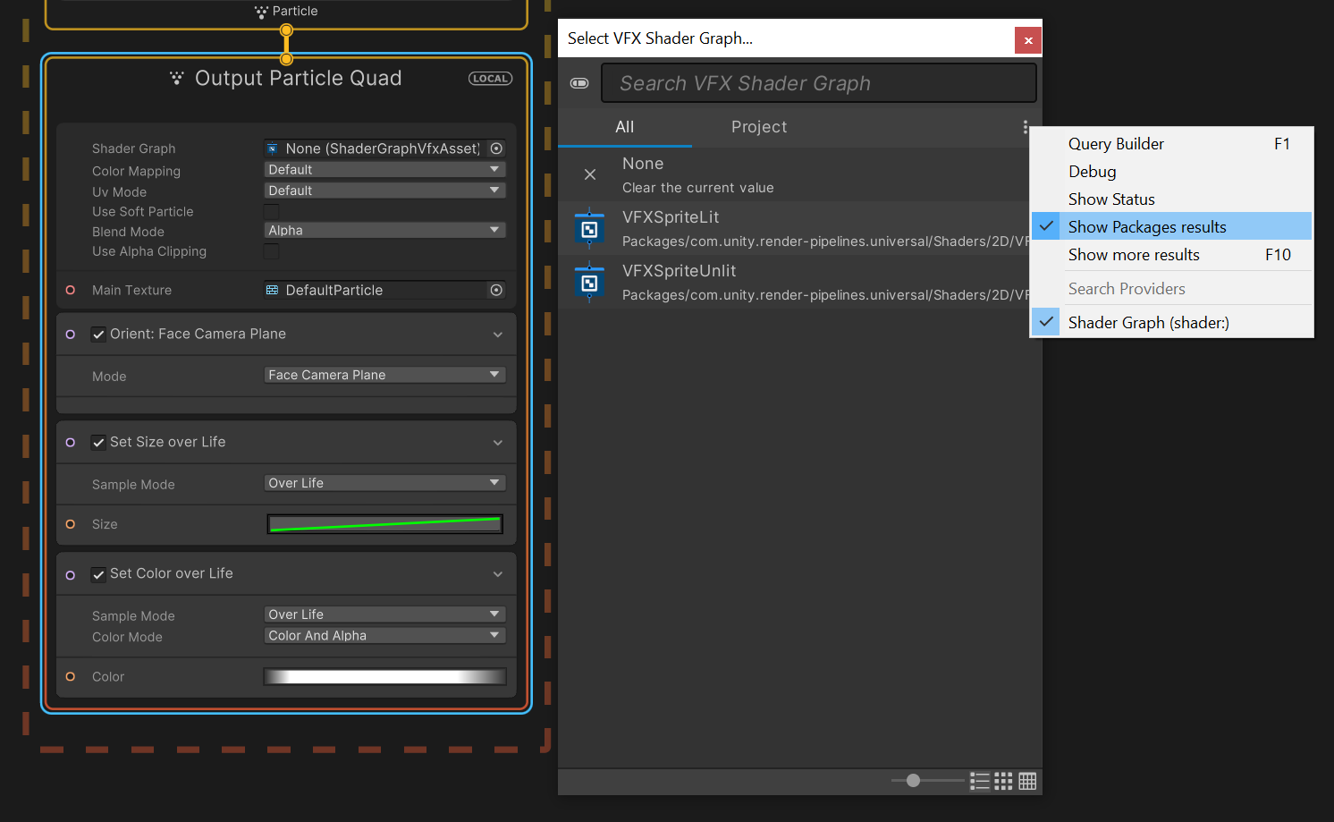 In the Select VFX Shader Graph window, open the context menu (right-click) and enable Show Packages results.