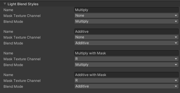 The asset can contain a total of four different Light Blend Styles, each with a different combination of Blend Style settings by default. All lights in the scene must pick from one of these available Light Blend Styles. When you create a light, it’s automatically assigned the first Blend Style listed in the asset.