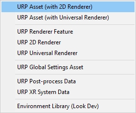 Create a new Pipeline Asset and Renderer Asset by going to the Assets menu and selecting Create > Rendering > URP Asset (with 2D Renderer).