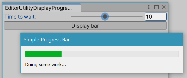// Shows a progress bar for the specified number of seconds. public class EditorUtilityDisplayProgressBar : EditorWindow { public float secs = 5f; [MenuItem("Examples/Progress Bar Usage")] static void Init() { var window = GetWindow(typeof(EditorUtilityDisplayProgressBar)); window.Show(); }