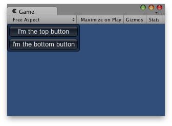 public class ExampleClass : MonoBehaviour { void OnGUI() { // Starts a vertical group using (var verticalScope = new VerticalScope("box")) { GUILayout.Button("I'm the top button"); GUILayout.Button("I'm the bottom button"); } // The group is now ended } }