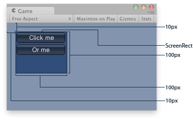 public class ExampleScript : MonoBehaviour { void OnGUI() { // Starts an area to draw elements GUILayout.BeginArea(new Rect(10, 10, 100, 100)); GUILayout.Button("Click me"); GUILayout.Button("Or me"); GUILayout.EndArea(); } }