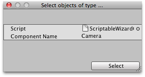 public class ScriptableWizardOnWizardCreate : ScriptableWizard { [MenuItem("Example/OnWizardCreate example")] public static void SelectAllOfTypeMenuIem() { ScriptableWizard.DisplayWizard( "Select objects of type ...", typeof(ScriptableWizardOnWizardCreate), "Select"); }