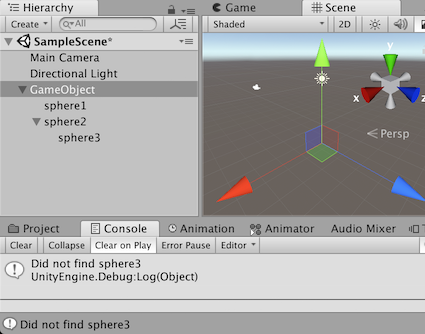// ExampleClass has a GameObject with three spheres attached. // Two of these are children of the GameObject. The third // transform, sphere3, is a child of sphere2. Find() does // not find this child.